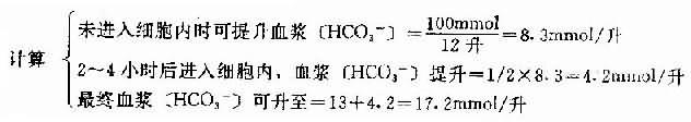 病人治疗后实测血浆[HCO3-]=16.7mmol/升 实践证明,上述规律是较为可靠的。因此在纠正酸碱中毒时应考虑离子转移这一变化。计算输液量时要将这一变化估计在内。