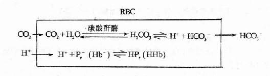 二、呼吸性酸中毒呼吸性中毒(Respiratory Acidosis)的特征是血浆[H2CO3]原发性增高。 (一)原因和机制 1.呼吸中枢抑制一些中枢神经系统的病变如延脑肿瘤、延脑型脊髓灰质炎、脑炎、脑膜炎、椎动脉栓塞或血栓形成、颅内压升高、颅脑外伤等时,呼吸中枢活动可受抑制,使通气减少而CO2蓄积。此外,一些药物如麻醉剂、镇静剂、镇静剂(吗啡、巴比妥钠等)均有抑制呼吸的作用,剂量过大亦可引起通气不足。碳酸酐酶抑制剂如乙酰唑胺能引起代谢性酸中毒前已述及。它也能抑制红细胞中的碳酸酐酶而使CO2在肺内从红细胞中释放减少,从而引起动脉血Pco2升高。有酸中毒倾向的伤病员应慎用此药。 2.呼吸神经、肌肉功能障碍 见于脊髓灰质炎、急性感染性多发性神经炎(Guillain-barre综合征)肉毒中毒,重症肌无力,低钾血症或家族性周期性麻痹,高位脊髓损伤等。严重者呼吸肌可麻痹。 3.胸廓异常胸廓异常影响呼吸运动常见的有脊柱后、侧凸,连枷胸(Flail Chest),关系强直性脊柱炎(Ankylosing Spondylitis),心肺性肥胖综合征(Picwick综合征)等。 5.广泛性肺疾病是呼吸性酸中毒的最常见的原因。它包括慢性阻塞性肺疾病、支气管哮喘、严重间质性肺疾病等。这些病变均能严重妨碍肺泡通气。 6.CO2吸入过多指吸入气中CO2浓度过高,如坑道、坦克等空间狭小通风不良之环境中。此时肺泡通气量并不减少。 (二)机体的代偿调节 由于呼吸性酸中毒是由呼吸障碍引起,故呼吸代偿难以发挥。H2CO3增加可由非碳酸氢盐缓冲系统进行缓冲,并生成HCO3-。但这种缓冲是有限度的。 1.细胞内外离子交换和细胞内缓冲这是急性呼吸性酸中毒的主要代偿调节。 细胞内外离子交换是指细胞外液[H+]升高时,H+进入细胞内,换出同符号的K+等。这样可以缓解细胞外液[H+]的升高。这与代谢性酸中毒时的离子交换一样。 所胃细胞内缓冲,是指进入细胞内的H+为细胞内缓冲物质如蛋白质(Pr-)等所缓冲,以及CO2弥散进入红细胞内的反应。此时由于CO2的蓄积而使Pco2急速升高,CO2通过红细胞膜进入红细胞内的正常过程加强。CO2与H2O在红细胞碳酸酐酶的催化下生成H2CO3,H2CO3解离为H+与H2CO3-。H+由血红蛋白缓冲,HCO3-转移至血浆中,使血浆HCO3-呈代偿性增加,如能使NaHCO3/H2CO3保持在正常范围内,则为代偿性呼吸性酸中毒。由于急性呼吸性酸中毒常发展迅速,肾脏代偿缓慢,故常为失代偿性的。 以CO2弥散入红细胞的量增加为例,其反应如下: