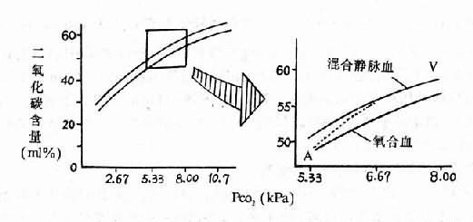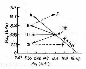 图13-4 呼吸衰竭时不同类型的血气变化A. PaO2↓PaCO2↑,二者变动值呈一定比例B. PaO2↓PaCO2↑,二者变动值不呈一定比例C.PaO2↓PaCO2,不变E. D用氧后D.PaO2↓PaCO2明显降低 F. B用氧后 部分肺泡通气血流比例失调时,往往只引起低氧血症而无高碳酸血症,主要是由血液二氧化碳解离曲线和氧离曲线的特性所决定。在PaCO2相当于5.00-8.00kPa(40-60mmHg)时,血液二氧化碳分压改变与二氧化碳的含量改变几乎呈直线关系(图13-5),在代偿性过度通气的肺泡,只要PAco2降低,血液中二氧化碳就可得到更多的排除,因此可以代偿那些通气不足的肺泡所造成的二氧化碳潴留。而氧离曲线的特点则与此不同。当氧分压为13.3kPa(100mmHg)时,血氧饱和度已达95~98%,过度通气的肺泡即使提高了氧分压,流经的血液氧饱和度和氧含量的增加也是极微少的,因此不能代偿通气不足的肺泡所造成的低氧血症(图13-6)。