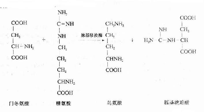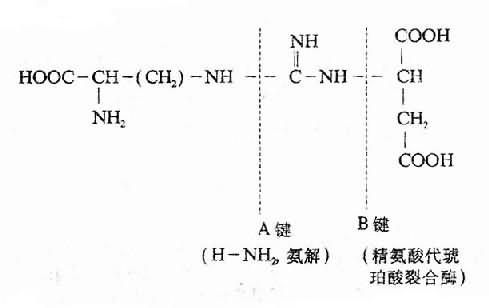 (2)在体内瓜氨酸和门冬氨酸可以生成精氨酸代琥珀酸。正常情况下,精氨酸代琥珀酸裂合酶活性高,故精氨酸代琥珀酸在B键处断裂,而生成延胡索酸和精氨酸。尿毒症时,有人认为血中尿素浓度增高可能引起此酶的活性降低,因而精氨酸代琥珀酸在A键处被裂解而生成鸟氨酸和胍基琥珀酸。
