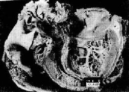 图8-21 风湿性疣状心内膜炎 二尖瓣和主动脉瓣闭锁缘见呈单行排列整齐的细小疣赘物 病变后期,心内膜下病灶发生纤维化,疣赘物亦发生机化。由于风湿病常反复发作,瘢痕形成越来越多。心壁内膜可增厚、粗糙和皱缩,尤以左心房后壁更为显著,称为McCallum斑(McCallum’s patch)。 心瓣膜由于病变反复发作和机化,大量结缔组织增生,致使瓣膜增厚、卷曲、缩短以及钙化,瓣叶之间可发生粘连和纤维性愈着,腱索增粗和缩短,终致形成慢性心瓣膜病(图8-22)。