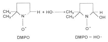 H2O2较稳定,反应性低,在体内浓度也比较低,(大鼠肝脏中为10-9M),对机体几乎无毒性;H2O2可与铁离子生成反应性非常高的·OH: H2O2+Fe2++H+→OH+Fe3++H2O H2O2的消除依赖于两种酶,一是过氧化氢酶,催化H2O2歧化反应:2H2O2→2H2O+O2;二是谷胱甘肽过氧化物酶。在GSH参与下使H2O2分解,GSH则变成氧化型谷胱甘肽。这两种酶可消除体内H2O2及过氧化物,防止血红蛋白及肝细胞膜部分被氧化破坏的可能。 (3)氢氧自由基(·OH):体内·OH从O2直接生成的反应尚不清楚,机体可由O2-生成系与H2O2生成系共同形成·OH自由基。水经放射线照射后的一级反应产物是·OH,由于·OH氧化能力很强,因此对机体毒性很大。 H2O2+Fe2++H+→OH+Fe3++H2O H2O2+O2-+H+→·OH+H2O+O2- ·OH在水中寿命很短,一般不易以自旋共振(ESR)方法检出,有人利用DMPO(5,5-二甲基-1-吡咯啉-N-氧化物)作自旋捕获,成功地检出白细胞内产生的·OH,因DMPO与·OH形成一个较稳定的加成物DMPO-HO·。另外也可采用生物反应检出。