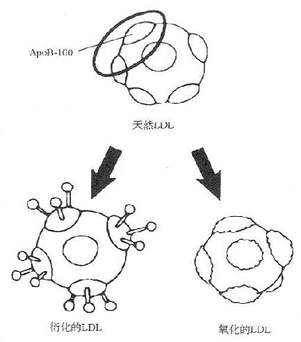 图9-7 泡沫细胞的形成巨噬细胞通过修饰LDL受体途径摄取(消化)修饰的LDL。导致大量的负荷脂质的小滴进入,泡沫细胞的形成是动脉粥样硬化进程中脂肪纹形成的标志。 (二)LDL的氧化修饰 1.LDL氧化修饰的形式 (1)细胞介导的LDL氧化修饰 1981年,Henriksen等人将兔主动脉内皮细胞和LDL孵育一段时间后,发现该LDL被巨噬细胞摄取的速度较未与内皮细胞共同孵育的LDL快,而且在孵育的基质中发现了硫代巴比妥酸反应物(TBARS),据此,认为内皮细胞可以氧化修饰LDL。这是细胞介导的LDL氧化修饰,又称生物氧化修饰的LDL。后来发现除内皮细胞外,巨噬细胞、血管内膜平滑肌细胞、单核细胞都可以氧化修饰LDL。 (2)过度金属离子介导的LDL氧化修饰 过度金属离子Ca2+、Fe2+等,在体外适宜条件下与LDL孵育一段时间后,也能使LDL发生氧化变构。因为这是利用化学物质氧化LDL,故称为化学氧化修饰的LDL。 (3)其他形式的氧化修饰 还可以使用物理学方法如紫外线、钴60对LDL进行氧化修饰。利用过氧化酶类也可能使LDL转变成OxLDL。 2.氧化修饰的过程 LDL的氧化可人为划分为三个阶段。最初为迟滞阶段,消耗内源性抗氧化剂(VitE);增殖阶段,PUFAs快速氧化为脂质氢过氧化物;分解阶段,脂质氢过氧化物转变为反庆性的醛。这些醛包括丙二醛(MDA)、4-羟烯酸(4-HNE)等,并可以和ApoB发生共价结合(主要和ApoB的赖氨酸残基结合),形成新的抗原决定簇。OxLDL丧失与天然LDL受体结合的能力,被清道夫受体所识别。 3.氧化修饰后LDL理化的生物学特性 OxLDL不同于天然LDL。OxLDL内维生素E含量下降,游离氨基减少,琼脂糖电泳速率增快。LDL中所含的大量卵磷脂转变为溶血卵磷脂。氧化修饰程度低时,ApoB以分解为主。修饰程度高时,降解的ApoB又可重新聚合成大分子。氧化LDL还具有一系列生物学毒性作用。氧化修饰后的LDL不能经LDL受体代谢,由清道夫受体识别、结合、内吞饮入细胞并丧失正常的胆固醇代谢途径,引起细胞内脂质沉积,泡沫样变。 4.修饰的LDL和氧化修饰的LDL的区别和联系 氧化的LDL是修饰LDL中的一类。修饰的LDL除包括氧化修饰的LDL外,还包括乙酰化LDL及丙二醛、4-羟烯酸直接结合的LDL,我们称这些未经氧化修饰,而仅经一般化学修饰的LDL为衍化的LDL。 衍化的LDL和OxLDL都可以被清道夫受体识别,导致泡沫细胞的形成。在过去的很长一段时间里,我们将一般化学修饰的衍化的LDL和OxLDL混为一谈。特别是认为氧化LDL就是MDA-LDL。但实际上,MDA-LDL不同于OxLDL。 用Ca2+引发LDL的氧化修饰,比较氧化修饰的LDL与脂质过氧化降解产物MDA修饰的LDL之间的差别。发现氧化修饰LDL和MDA修饰LDL都产生类似于脂褐质的荧光物质,都可使LDL上的游离氨基减少,琼脂糖电泳速度加快,且游离氨基减少量与电泳迁移率增加呈正相关。但两类不同的修饰LDL之间也有差异,主要表现在:①对细胞生理功能影响不同。氧化LDL可诱发细胞毒性作用,影响花生四烯酸的代谢,抑制胆固醇酯化作用等,而一般化学修饰的LDL则无上述效应;②氧化修饰消耗LDL内源性抗氧化物质,使LDL上的维生素E含量下降,而MDA修饰无上述改变;③氧化修饰涉及脂质过氧化反应,LDL中的PUFAs被氧化。MDA对LDL修饰,是直接和ApoB-100结合成希夫氏碱,脂质过氧化反应轻微;④氧化LDL在氧化程度低时,ApoB降解,在氧化程度高时,ApoB又可发生再聚合。MDA对LDL的修饰,ApoB无降解、聚合反应发生;⑤氧化LDL产生的荧光峰波长为430nm,而MDA修饰LDL的荧光峰波长为460nm。这些差异可能是由于两类不同的修饰对LDL结构与组成影响不同,提示我们不能简单地把脂质过氧化降解产物修饰的LDL等同于OxLDL。