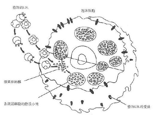 图9-6 LDL的修饰在内皮下间隙,被俘获的天然的LDL可能经历两种形式的修饰-衍化(MAD粘附于ApoB-100或者ApoB-100的糖基化)、氧化(ApoB-100被过氧化物降解),分别形成衍化的LDL和氧化的LDL。 天然LDL在正常情况下,由LDL受体识别。LDL和LDL受体结合后,内吞入细胞,与溶酶体结合。在溶酶体酶的作用下,蛋白质降解为氨基酸,胆固醇酯水解为游离胆固醇和脂肪酸。此受体受到细胞内胆固醇含量的下降调节,当细胞内胆固醇的含量增多时,LDL受体的量便会减少。所以,天然LDL经这一途径代谢,不会引起胆固醇酯在细胞内堆积。 LDL还可以通过清道夫受体途径代谢。这一受体主要参与修饰的LDL的代谢,没有下降调节的特点,不受细胞内胆固醇的含量的应答。通过此途径,修饰LDL被摄取和降解的速度都比正常LDL快。所以LDL这一代谢途径直接参与动脉粥样硬化中泡沫细胞的形成,如图9-7所示。