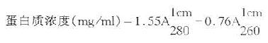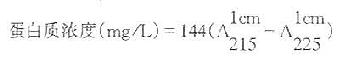 所有的蛋白质在230nm以下都有强吸收。例如,牛血清白蛋白的α0.1%在225nm和215nm处分别为5.0和11.7,而在280nm处测为0.58。在230nm以下的强吸收是由于肽键的存在,因此,此值对所有的蛋白质都是一样的。从215nm和225nm处的光密度之差可用于测定浓度为10μl/ml~100μl/ml的蛋白质。蛋白质浓度可以近似地由下式得到: