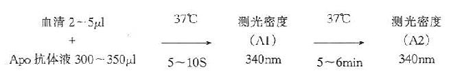 混匀各管,置37℃水浴保温10min,按程序上机作工作曲线。 ②标本测定:吸待测血清(测定管)5μl,加上述稀释抗血清工作液1.0ml,于37℃水浴保温10min,上机读数,打印结果。 ③如测定值超过工作曲线上限值,仪器会打印显示“过高”,此时,将待测标本稀释1倍再测。 ④每批号的抗血清应作一次多点定标,即测定标本的抗血清应与定标的抗血清是同一批号抗血清。 (二)生化分析仪测定 1.原理 脂蛋白抗原在溶液中与相应特异抗体形成抗原抗体复合物的混浊颗粒分散于溶液介质中,在一定波长下测定其混浊程度,进行ApoAⅠ(B100)的定量测定。 ApoAⅠ(B100)+抗人ApoAⅠ(B100)→抗原抗体复合物→测定吸光光密度 2.双试剂单(双)波长法 (1)试剂(温州伊利康) RⅠ:Apo缓冲液,含4% PEG6000和表面活性。 RⅡ:羊抗人ApoA(B100)稀释抗血清 RⅢ:Apo定值血清 (2)各试剂及标本用量如下表: