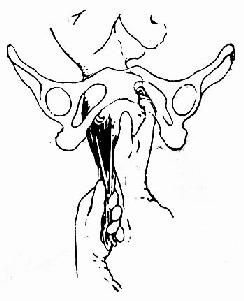 穿颅术先穿破胎儿头颅,捣碎脑质,再夹碎颅骨使体积缩小,便于娩出。手术多在死胎急需娩出,臀位死产头娩出有困难以及脑积水儿无法娩出等情况下进行。 一、手术条件 (一)宫口开全或近于开全;(二)骨腔至少能容一手通过,如过于狭窄,虽穿颅也难以从阴道娩出胎儿。 二、手术步骤 (一)穿颅 顶先露时以囱门或骨缝作为穿刺点,颜面先露则经眼窝或由口腔经上腭刺入,臀位产后出头由枕骨大孔或颈椎刺入。头未固定者,由助手在腹部施压固定。 右手握穿颅器,在左手保护下送入阴道,并用食、中二指将刃部固定于穿刺点上,避免刺进时滑脱损伤产道软组织(图231)。刺入颅内后,张开两刃,旋转90度再撑开,以进一步扩大创口(图233)。然后将刃的全部伸入颅内,来回捣碎脑质使从破口流出,颅骨随即塌陷,体积缩小。最后闭合两刃,在左手保护下退出阴道。无穿颅器时,可用长剪代替。 (二)碎颅 先将碎颅器的无窗内叶经破口置入颅内,凸面指向额骨内面,然后放入有窗外叶,凹面向着额骨外面,作适当调整使二柄扣合,拧紧螺旋(图232)。 如系三叶碎颅器,则先放入中心杆,再相继置放前、后叶,拧紧螺旋后牵引。能用二叶牵出胎儿者,即不一定要用三叶。 (三)牵引 仔细检查,避免夹住产道软组织。然后顺产轴缓缓牵出胎儿。一手应始终置儿头周围,以防破碎颅骨损伤软产道。 如无碎颅器,可用有齿长钳数把紧夹颅骨,另将手指伸入儿口扣住上腭协同牵出胎儿(图234)。