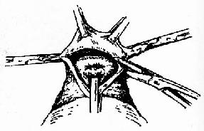图260 再在两侧各下一把钳后切开阴道前穹窿 宫颈两旁静脉丛较丰富(图250)过分用力推挤有时可损伤静脉管壁引起出血,应注意之。如静脉破裂出血,用纱布压迫片刻多即止血,而钳夹则常使破口扩大,且越来越大,不但不易止血,反易损伤邻近的输尿管。 牵开膀胱,用有齿止血钳一把紧贴宫颈的两侧缘将主韧带(阔韧带基底部组织,内有子宫动静脉通过)及子宫骶骨韧带一并夹紧,这样子宫的血运已基本上被阻断,再向上用力牵提子宫,即可阻断来自阴道方面的少量血流。先切断一侧,用7号或10号丝线缝扎,为安全起见,再将动脉断端用7号线扎一道(图258、259)同法处理对侧。操作中除有少量子宫回血外,多不出血。一般经此处理后,即可将子宫切除。如宫颈较肥大,可按同法分两步或三步来游离宫颈,最后切除子宫(图260)。我们置单钳于宫颈侧,是为了能离输尿管更远一点操作,增加安全性。