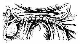 图264 缝合阴道断端 (六)切除子宫 在子宫直肠窝填入纱布垫一块,以吸收可能从阴道漏出的分泌物。提起子宫,切开阴道前穹窿,钳夹并提起阴道前壁,从切口塞入一小块纱布,以防止阴道内积液流出,污染盆腔(图261)。然后钳夹宫颈前唇向上提,沿阴道穹窿剪开,切除子宫(图262)。环切阴道穹窿时,随时注意将宫颈提起,使既利于剪切,而又不与周围接触,防止污染(图263)。每切开一段即将阴道断端夹住,以减少出血,并用以牵引,便于切除子宫后缝合。 凡与阴道接触过的器械,用后立即置于污染盆内。 (七)缝合阴道断端及盆腔腹膜 切去子宫后,用碘酒、酒精棉球涂擦阴道断端,然后用1号或2号铬制肠线作“8”字间断缝合(图264)或连续缝合。注意缝好断端的两角。最后,仔细检查两侧输尿管的粗细及蠕动情况以及各缝合点有无出血等。如无异常,先连续缝合盆腔腹膜(图265、266),然后常规关闭腹腔。术毕从阴道内抽去纱布。