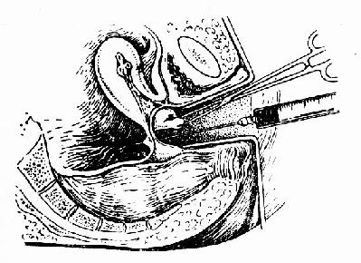 图91 阴道后穹窿穿刺 (二)妊娠试验 胚胎存活或滋养细胞具有活力时,合体细胞分泌hCG,妊娠试验可呈阳性。由于异位妊娠患者体内的hCG水平较正常妊娠时为低,故一般的hCG测定方法,阳性率较低,须采用更为敏感的β-hCg 放射免疫法或单克隆抗体酶标法进行检测。 (三)超声诊断 早期输卵管妊娠时,B超显象可见子宫增大,但宫腔空虚,宫旁有一低回声区。此种图象并非输卵管妊娠的声象特征,需排除早期宫内妊娠伴有妊娠黄体的可能。用超声检测妊娠囊和胎心搏动对诊断异位妊娠十分重要,如妊娠位于宫外,即可诊断为宫外妊娠;妊娠囊位于宫内,则多可排除宫外妊娠。B超早期诊断间质部妊娠有重要临床意义,可显示一侧子宫角突出,局部肌层增厚,内有明显的妊娠囊。 (四)腹腔镜检查 有条件及必要时可采用腹腔镜检查。 (五)子宫内膜病理检查 诊断性刮宫仅适用于阴道出血较多的患者,目的是排除宫内妊娠。宫腔排出物应常规送病理检查,切片中如见到绒毛,可诊断为宫内妊娠,如仅见蜕膜而无绒毛,虽应考虑为异位妊娠,但不能确诊。 五、鉴别诊断 输卵管妊娠应与宫内妊娠流产、急性阑尾炎、黄体破裂及卵巢囊肿蒂扭转等鉴别,见附表。 六、治疗 (一)手术治疗 输卵管妊娠的治疗原则以手术治疗为主。一般在确诊后即应进行手术。手术方式一般采用全输卵管切除术。有绝育要求者可同时结扎对侧输卵管。对有生育要求的年轻妇女,如对侧输卵管已切除或有明显病变,可行保守性手术,以保留输卵管及其功能。根据患者全身情况、孕卵着床部位及输卵管病变程度选择术式,如伞端妊娠时行孕卵压出术,壶腹部妊娠行切开术取出孕卵,峡部妊娠可行病灶切除及断端吻合术,采用显微外科技术可提高妊娠率。输卵管间质部妊娠的处理,可根据病变情况行患侧子宫角切除或全子宫切除术。近年来国内外开展腹腔镜诊断和治疗输卵管妊娠。 异位妊娠的鉴别诊断