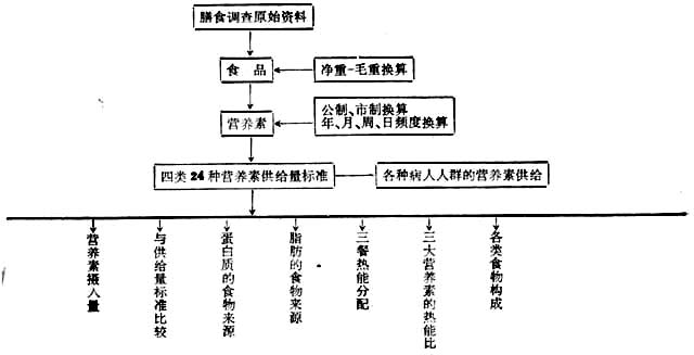 每一类中又分若干种,以序号编排。如A类中A1:籼米,A2:粳米等。 (3)数据的安排与准备 ①随机文件数据:程序使用了四个放在磁盘上的随机文件。它们是:DATA1——一般营养成分表,DATA2——氨基酸含量表,DATA3——脂肪酸,胆固醇含量表,DATA4——24种人员营养素供给量表。程序均以软盘形式加以保存和应用。 每一种食品的相应营养成份又成为一个记录。因此,程序运行时以文件名字和记录号存取相应食品的数据。 ②程序中DATA语句输入的数据;调查数据的预处理分为两类: 第一类:集体食堂调查所得各餐用膳人数及各类食品每餐摄入量。且将用膳人数处理成不同劳动强度的人日数。 第二类:个体询问法或记录法,以频度和估量的方法获得各类食品每年、每月、每周或每日的摄入量。 例如第二类预处理包括:A.输入重量单位选用g还是斤;B.所要计算的个体数;C.食物的重量是净重还是毛重;D.计算内容的选择(一般营养素、氨基酸、脂肪酸等的选择);E.计算对象所属劳动强度的编号。以上数据在程序运行中,以人机对话形式,经计算机屏幕提示,作为控制参数,由键盘输入(附运算示意图)。 (4)运算示意图 膳食营养成分运算示意图说明: ①膳食调查原始资料。每人每日餐摄入食物的名称,数量(斤或g,毛重或净重),或集体单位进食人数和性别比例和劳动强度分级。 ②营养素。在计算程序运行中可任意选择。按用户的需求进行运算。包括一般营养成分(食物成分表中所列)、必需氨基酸、饱和与不饱和脂肪酸、胆固醇、钾、钠、氯、镁以及微量元素等。 ③各种病人的特殊营养素供给要求,主要指糖尿病、心血管疾病、外科手术病人及不同肿瘤患者等的营养要求。 ④特殊人群的营养素供给要求,主要指各类运动员,舞蹈演员、接触有毒有害物质的人群及老年人等 对于已经编制好的程序附有应用说明者,用户可根据该程序的说明和操作步骤,只需短期操作训练,即能运用自如。 输出结果(用户可根据需要选择其中下列若干表格); 表42-7——一般营养素摄入量以及占供给标准的比例。 表42-8——氨基酸摄入量。 表42-9——脂肪酸胆固醇摄入量。 表42-10——蛋白质的食物来源。 表42-11——脂肪的食物来源。 表42-12——三大营养素所供热能及热能的三餐分本。 表42-7 每人每日营养素摄入量及与供给量标准比较