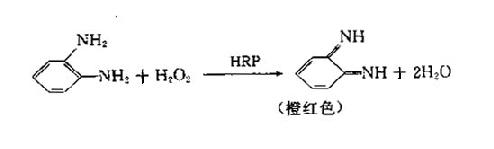 上式中DH2为供氢体,H2O2O为受氢体。HRP对受氢体的专一性很高,除H2O2外,仅作用于小分子醇的过氧化物和尿素的过氧化物。后者为固体,作为试剂较H2O2方便。许多化合物可作为HRP的供氧体,在ELISA中常用的供氢体底物为邻苯二胺(orthopenylenediamine,OPD)、四甲基联苯胺(3,3',5,5'-tetramethylbenzidine,TMB)和ABTS[2,2'-azino-bis(3-ethyl-benzthiazolinesulfonate-6)]。 OPD为在ELISA中应用最多的底物,灵敏度高,比色方便。其缺点是配成应用液后稳定性差,而且具有致异变性。TMB无此缺点。TMB经酶作用后由无色变蓝色,目测对比鲜明;加酸停止酶反应后变黄色,可在比色计中定量;因此应用日见增多。ABTS,虽然灵敏度不如OPD和TMB,但空白值很低。HRP催化OPD的反应如下: