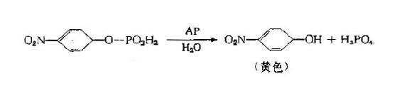 HRP的纯度用RZ(ReinheitZahl,意为纯度数)表示,是403nm的吸光度与280nm的吸光度之比,高纯度的HRP的RZ≥3.0。应注意的是酶变性后,RZ可不变而活力降低,故重用酶制剂时更重要的指标为活力。酶活力以单位表示:1min将1μmol的底物转化为产物的酶量为1个单位。 在ELISA中另一常用的酶为碱性磷酸酶。从大肠杆菌提取的AP分子量为80kD,酶作用的最适pH为8.0;用小牛肠粘膜提取的AP分子量为100kD,最适pH为9.6。一般采用对硝基苯磷酸酯(p-nitrophenylphosphate,p-NPP)作为底物。它可制成片状试剂,使用方便。产物为黄色的对硝基酚,在405nm有吸收峰。用NaOH终止酶反应后,黄色可稳定一段时间。反应式如下: