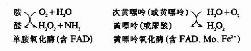 2.需氧脱氢酶类(aerobic dehydrogenases) 需氧脱氢酶以FAD或FMN为辅基,以氧为直接受氢体,产物为H2O2或超氧离子(O2),某些色素如甲烯蓝(methylene blue,MB)、铁氰化钾([K3Fe(CN)6]、二氯酚靛酚可以作为这类酶的人工受氢体。如D氨基酸氧化酶(辅基FAD)、L-氨基酸氧化酶(辅基FMN)、黄嘌呤氧化酶(辅基FAD)、醛脱氢酶(辅基FAD)、单胺氧化酶(辅基FAD)、二胺氧化酶等。