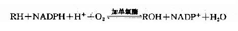 4.加氧酶类(oxygenases) 顾名思义,加氧酶催化加氧反应。根据向底物分子中加入氧原子的数目,又可分为加单氧酶(monooxygenase)和加双氧酶(dioxygenase)。 (1)加单氧酶 又称为多功能氧化酶、混合功能氧化酶(mixed function oxidase)、羟化酶(hydroxylase)。加单氧酶催化O2分子中的一个原子加到底物分子上使之羟化,另一个氧原子被NADPH+H+提供的氢还原生成水,在此氧化过程中无高能磷酸化合物生成,反应如下: