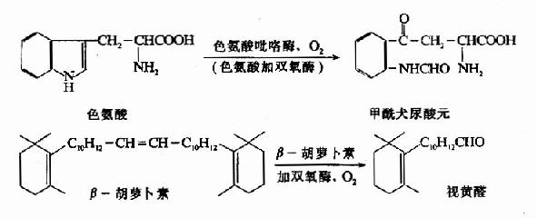 加单氧酶实际上是含有黄素酶及细胞色素的酶体系,常常是由细胞色素P450、NADPH细胞色素P450还原酶、NADPH和磷脂组成的复合物。细胞色素P450是一种以血色素为辅基的b族细胞色素,其中的Fe3+可被Na2S2O3等还原为Fe2+,还原型的细胞色素P450与CO结合后在450nm有最大吸收峰,故名细胞色素P450,它的作用类似于细胞色素aa3,能与氧直接反应,将电子传递给氧,因此也是一种终末氧化酶。 加单氧酶主要分布在肝、肾组织微粒体中,少数加单氧酶也存在于线粒体中,加单氧酶主要参与类固醇激素(性激素、肾上腺皮质激素)、胆汁酸盐、胆色素、活性维生素D的生成和某些药物、毒物的生物转化过程。加单氧酶可受底物诱导,而且细胞色素P450基质特异性低,一种基质提高了加单氧酶的活性便可同时加快几种物质的代谢速度,这与体内的药物代谢关系十分密切,例如以苯巴比妥作诱导物,可以提高机体代谢胆红素、睾酮、氢化可地松、香豆素、洋地黄毒苷的速度,临床用药时应予考虑。 (2)加双氧酶 此酶催化O2分子中的两个原子分别加到底物分子中构成双键的两个碳原子上,如色氨酸吡咯酶(色氨酸加双氧酶)、胡萝卜素加双氧酶分别催化下述反应: