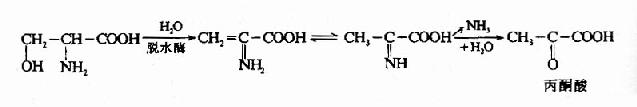图7-4 腺嘌呤核苷酸循环 目前认为嘌呤核苷酸循环是骨骼肌和心肌中氨基酸脱氨的主要方式。John lowenstein证明此嘌呤核苷酸循环在肌肉组织代谢中具有重要作用。肌肉活动增加时需要三羧酸循环增强以供能。而此过程需三羧酸循环中间产物增加,肌肉组织中缺乏能催化这种补偿反应的酶。肌肉组织则依赖此嘌呤核苷酸循环补充中间产物-草酰乙酸。研究表明肌肉组织中催化嘌呤核苷酸循环反应的三种酶的活性均比其它组织中高几倍。AMP脱氨酶遗传缺陷患者(肌腺嘌呤脱氨酶缺乏症)易疲劳,而且运运后常出现痛性痉挛。 这种形式的联合脱氨是不可逆的,因而不能通过其逆过程合成非必需氨基酸。这一代谢途径不仅把氨基酸代谢与糖代谢、脂代谢联系起来,而且也把氨基酸代谢与核苷酸代谢联系起来。 (四)非氧化脱氨基作用(nonoxidativedeamination) 某些氨基酸还可以通过非氧化脱氨基作用将氨基脱掉。 1.脱水脱氨基 如丝氨酸可在丝氨酸脱水酶的催化下生成氨和丙酮酸。