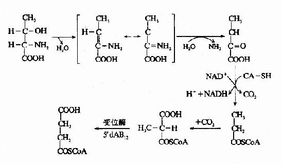 苏氨酸在苏氨酸脱水酶的作用下,生成α-酮丁酸,再经丙酰辅酶A,琥珀酰AoC参加代谢,如下图所示。