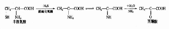 这是苏氨酸在体内分解的途径之一。 2.脱硫化氢脱氨基 半胱氨酸可在脱硫化氢酶的催化下生成丙酮酸和氨。