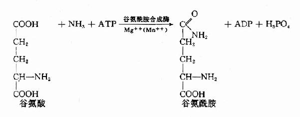图7-6 葡萄糖丙氨酸循环 饥饿时通过此循环将肌肉组织中氨基酸分解生成的氨及葡萄糖的不完全分解产物丙酮酸,以无毒性的丙氨酸形式转运到肝脏作为糖异生的原料。肝脏异性生成的葡萄糖可被肌肉或其它外周组织利用。 2.氨与谷氨酸在谷氨酰胺合成酶(glutamine synthetase)的催化下生成谷氨酰胺(glutamine),并由血液运输至肝或肾,再经谷氨酰酶(glutaminaes)水解成谷氨酸和氨。谷氨酰胺主要从脑、肌肉等组织向肝或肾运氨。
