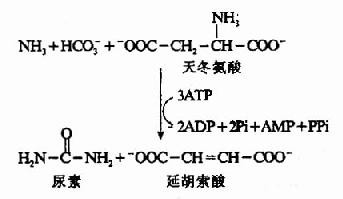 尿素中的两个N原子分别由氨和天冬氨酸提供,而C原子来自HCO-3,五步酶促反应,二步在线粒体中,三步在胞液中进行。其详细过程可分为以下五步:
