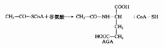 真核细胞中有两种CPS:(1)线粒体CPS-Ⅰ利用游离NH3为氮源合成氨基甲酰磷酸,参与尿素合成。(2)胞液CPS-Ⅱ,利用谷氨酰胺作N源,参与嘧啶的从头合成。 CPS-Ⅰ催化的反应包括下述三步(图7-7)。 (1)ATP活化HCO-3生成ADP和羰基硫酸(carbonyl phosphate) (2)NH2与羰基硫酸作用替代硫酸根,生成氨基甲酸(carbamate)和Pi。 (3)第2个ATP对氨甲酸磷酸化,生成氨基甲酰磷酸和ADP。 此反应是不可逆的,消耗2分子ATP。CPS1是一种变构酶,AGA是此酶变构激活剂。由乙酰CoA和谷氨酸缩合而成。