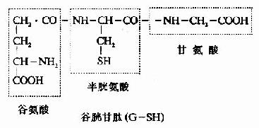 谷胱甘胱还原酶催化上面反应,辅酶为NADPH,细胞中GSH与GSSG的比例为100:1。GSH可保护某些蛋白质及酶分子的巯基不被氧化,从而维持其生物活性。如红细胞中含有较多GSH,对保护红细胞膜完整性及促使高铁血红蛋白还原为血红蛋白均有重要作用。此外,体内产生的过氧化物及自由基,亦可通过含硒的GSH过氧化酶而被清除,如: