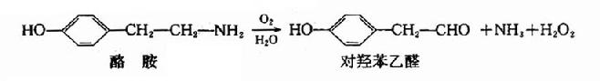 图11-2 加单氧酶系的反应过程 (3)加单氧酶系的生理意义及作用特点 加单氧酶系的生理意义是参与药物和毒物的转化。经羟化作用后可加强药物或毒物的水溶性有利于排泄。如甲苯为常用化工原料,在肝脏经加氧羟化生成对-甲酸,极性增强,易于排出体外。另外,维生素D3羟化为具有生物活性的25-(OH)D3。 加单氧酶系酶可诱导生成,如苯巴比妥类药物可诱导加单氧酶的合成,长期服用此类药物的病人,对异戊巴比妥,氨基比林等多种药物的转化及耐受能力亦同时增强。 2.线粒体单胺氧化酶系 胺氧化酶属于黄素酶类,存在于线粒体中,可催化组胺、酪胺、尸胺、腐胺等肠道腐败产物氧化脱胺,生成相应的醛类。例如: