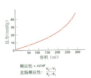 8.89 点1(P1,V1),点2(P2,V2);顺应性为(V2-V1)/(P2-P1)。 3 检测肛门直肠顺应性 空腔脏器的顺应性即其对内在牵张刺激的反应性。 此顺应性定义为压力——容积曲线的斜率(图8.89)。 ·将带有低顺应性气囊的内脏刺激仪导管置于直肠内 ·将内脏刺激器/电子气压泵利用时相性刺激方法,按2mmHg梯度递增向气囊内注气,直至患者最大耐受容积(图8.90)