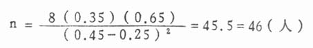 二、用计算法估计样本含量我们运用前面学过的某些假设检验公式,就可以进行样本含量的计算。下面仅举两例略作介绍。这里的公式仅适用于α=0.05,1—β=0.50。而且都是双侧检验。 (一)两个率比较时样本含量的计算 令n为每组所需例数,P1、P2为已知的两个率(用小数表示),P为合并的率,当设两组例数相等时,即P=(P1+P2)/2。q=1=p,则