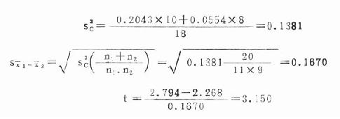 自由度v=11+9-2=18,查t界值表得t0.01(18)=2.878,今t=3.150>2.878,P<0.01,按α=0.05检验水准拒绝H0,接受H1,可认为两组平均效价不同,标准株高于水生株。