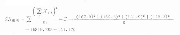 H0:湖水四个季节氯化物含量的总体均数相等,即μ1=μ2=μ3=μ4 H1:四个总体均数不等或不全相等 α=0.05 先作表19-8下半部分的基础计算。 C= (Σx)2/N=(588.4)2/32=10819.205 SS总=Σx2-C=11100.84-10819.205=281.635 V总=N-1=31