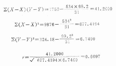 为了获得公式22.2中各数据,先将表22-1资料进行计算如表22-2。 从表22-2的计算获得 ΣX=534 ΣX2=9876 ΣY=99.2ΣY2=324.18 ΣXY=1750 N=31 按这些数据进一步以下演算求r。