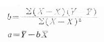 (一)直线回归方程式(linear regression equation)的计算直线回归方程的通式为: =a+bX 公式(22.3) 式中Y为自由变量X推算因变量Y的估计值,a为回归直线在Y轴上的截距,即X=0时的Y值;b为样本回归系数(regression coefficient),即回归直线的斜率(slope或称坡度),表示当X变动一个单位时,Y平均变动b个单位。如果已知a与b,用以代入公式(22.3),即可求得直线回归方程。求a和b的公式分别为: