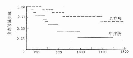 同法可以求得乙疗法的累计缓解率及其标准误,学者试自演算求解。 6.缓解率曲线描绘以横轴为随访天数(n),纵轴为累计缓解率(np0),将两疗法的演算结果各点的坐标准确标出,然后将各点向右连成与横轴平行的阶梯形,得出两组缓解曲线如图23-1。可以看出乙疗法累计缓解率水平始终在甲法之上。